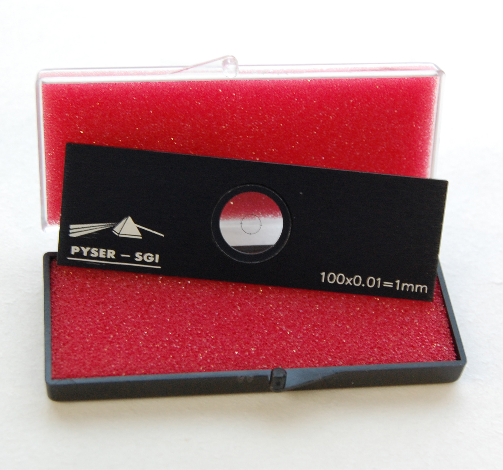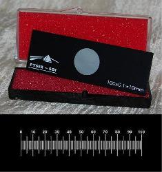 微尺一般是圓形,鑲嵌在一個(gè)黑色的陽(yáng)極氧化鋁膜鍍層的載玻片內(nèi),載玻片尺寸:76mm x 25mm x 1.5mm。