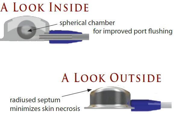 三、SwirlPort:具有球形腔室的輸液港,SwirlPort為研究人員提供了新的輸液港技術(shù),球形腔室的形狀消除了所有出現(xiàn)“潴留漿的角落,與類似大小的輸液港比較,減少了腔室整體體積。這種腔室的形狀已被證明對(duì)腔室沖洗體積有可測(cè)量的影響,該體積必須用來清潔”腔室的血液和藥物殘留量。與傳統(tǒng)端口相比,球形的腔室沖洗流量最低,且該流量與沖洗流速無關(guān)。目前可以提供三種大?。捍?span lang="EN-US">-MAX(0.53ml);中-MID(0.33ml);小-MIN(0.18ml)。