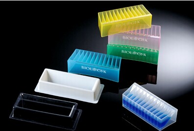 12道彩色試劑槽,每道的容積為5ml,并且每道都有印刷的數(shù)字標(biāo)識,試劑槽反面同樣可以使用,可以容納50ml液體,材料為醫(yī)療級聚丙烯,不消毒,5種混合色:紅,藍(lán),綠,黃和透明色,100個/箱。