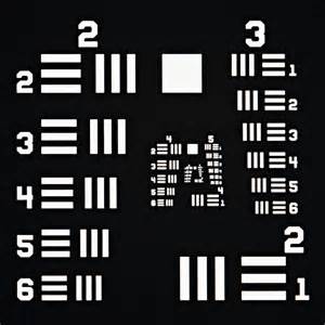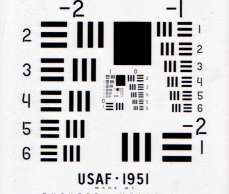 美國(guó)空軍1951年分辨力測(cè)試圖一直是世界上檢測(cè)垂直與水平分辨力的通用標(biāo)準(zhǔn),是符合MIL-STD-150A標(biāo)準(zhǔn)的分辨力測(cè)試圖案,由美國(guó)空軍于1951年創(chuàng)建。1951 USAF分辨力測(cè)試圖目前仍廣泛地應(yīng)用于測(cè)試光學(xué)成像系統(tǒng)(如顯微鏡和相機(jī))的分辨能力。這種圖案包括幾組由三條短線構(gòu)成組合,短線的尺寸從大到小。成像系統(tǒng)無(wú)法辯明的最大短線組為其分辨能力極限。