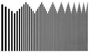 可變線性光柵測試靶, 提供90根線條,分布總寬度是100mm。分辨率從1.25線對/毫米到250線對/毫米,該測試靶主要用來確定光學系統(tǒng)的分辨率。線條長度變化可以幫助數(shù)數(shù)。由低反射率、真空濺射的鉻電鍍到厚0.175mm厚的聚酯膜上.