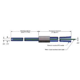 該導(dǎo)管系統(tǒng)提供最小直徑導(dǎo)管 /管芯產(chǎn)品,適用于小鼠和其它小型研究動(dòng)物的心血管、顱內(nèi)實(shí)驗(yàn)應(yīng)用。32G小鼠顱內(nèi)導(dǎo)管構(gòu)造圖見下,前端也是主要部分長11.7cm,尺寸32G 的聚氨酯導(dǎo)管(0.010英寸O.D./ 0.005英寸 I.D.);緊接著后段是過渡連接區(qū)域長大約7.6cm,其末端膨大為喇叭形連接口(可配套27 G 針);整個(gè)導(dǎo)管內(nèi)有一條直徑 0.003英寸 的特氟龍材料包被的不銹鋼針(鈍頭針)。該導(dǎo)管系統(tǒng)獨(dú)立包裝。