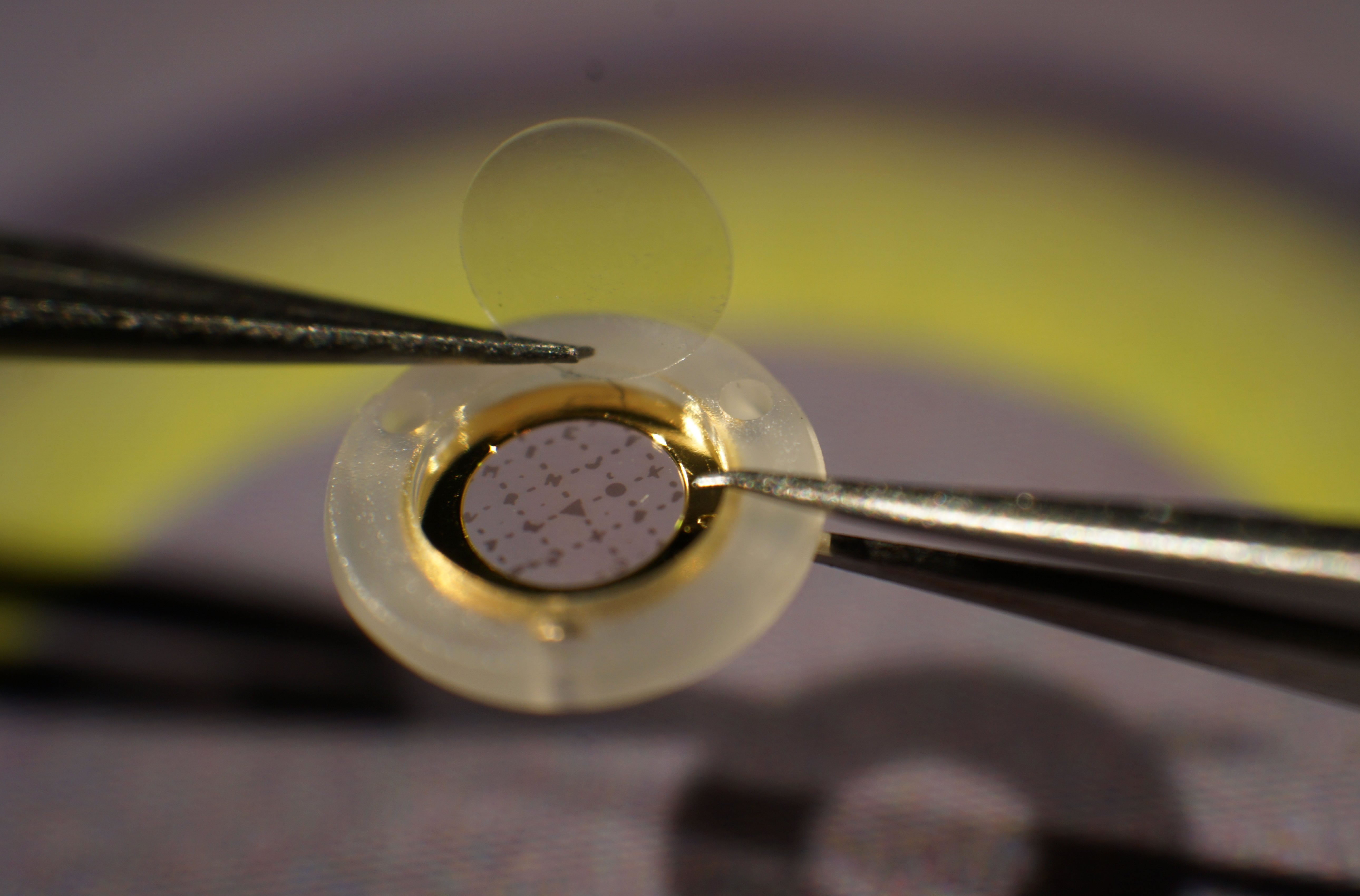 這是專(zhuān)門(mén)為萊卡高壓冷凍儀HPM100設(shè)計(jì)的一款樣本準(zhǔn)備工具,整體類(lèi)似一個(gè)小型培養(yǎng)皿。首先在藍(lán)寶石圓片(載物作用)上置一個(gè)50微米厚度的黃金圓環(huán),外夾環(huán)形塑料片,具體的樣子見(jiàn)下圖。樣本置于載物作用的藍(lán)寶石圓片上,再覆一個(gè)蓋片,蓋片也是藍(lán)寶石圓片,可以簡(jiǎn)單地把樣本封在兩個(gè)藍(lán)寶石圓片之間,樣本艙置于一個(gè)特殊的特殊的適配器內(nèi)(HPM100,HPM010,HPF COMPACT O2儀器均有這樣的適配器)?;罴?xì)胞之類(lèi)的樣本在進(jìn)入高壓冷凍儀之前在這個(gè)樣本艙內(nèi)可以直接在光鏡下觀察呈像。從高壓冷凍儀內(nèi)出來(lái),進(jìn)一步進(jìn)行冷凍替代和常溫切片。